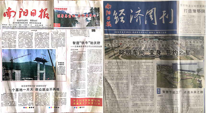 從智能制造到清潔生產、節(jié)能減排,一月內《南陽日報》于8月11日、、8月29日連續(xù)兩次報道亞澳農機,河南衛(wèi)視《新聞聯(lián)播》聯(lián)動報道。