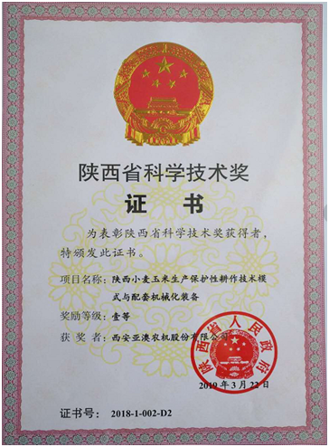 日前,全省科技創(chuàng)新大會(huì)暨科學(xué)技術(shù)獎(jiǎng)勵(lì)大會(huì)在西安隆重召開,省委書記胡和平出席會(huì)議并講話,省長(zhǎng)劉國中主持會(huì)議,會(huì)議表彰了2018年度省科學(xué)技術(shù)獎(jiǎng)獲獎(jiǎng)項(xiàng)目,并向最高成就獎(jiǎng)及一等獎(jiǎng)獲獎(jiǎng)?wù)哳C發(fā)了獎(jiǎng)勵(lì)證書。亞澳農(nóng)機(jī)和西北農(nóng)林科技大學(xué)合作研發(fā)的“陜西小麥玉米生產(chǎn)保護(hù)性耕作技術(shù)模式與配套機(jī)械化裝備”項(xiàng)目成果榮獲省科技進(jìn)步一等獎(jiǎng)。