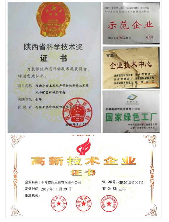 亞澳農(nóng)機堅持“產(chǎn)品就是人品、內(nèi)在是我心、外在是我臉”的品質(zhì)原則,多功能變速旋耕機、旋播施肥機、聯(lián)合耕整機、雙軸滅茬機、精量免耕播種機、深松機等產(chǎn)品在耕整機械(主機配套40-300馬力)領域處于行業(yè)前列, 累計取得自主專利78項。2018年“亞澳”商標獲得中國馳名商標,產(chǎn)品多次被中國農(nóng)機化協(xié)會、中國農(nóng)業(yè)機械流通協(xié)會、中國農(nóng)業(yè)機械工業(yè)協(xié)會授予“AAA級信用企業(yè)”、“技術(shù)進步獎”、“產(chǎn)品創(chuàng)新獎”、“全國農(nóng)機用戶滿意品牌”、“最具影響力品牌”,被國家相關(guān)部委單位授予農(nóng)業(yè)部科技進步三等獎、星火計劃金獎、西安市科技進步一等獎、陜西省行業(yè)之星企業(yè),“專精特新”中小企業(yè),南陽市級科技百強企業(yè)等多項殊榮;國家型高新技術(shù)企業(yè),在農(nóng)機行業(yè)中具有較高的美譽和知名度,得到了社會的廣泛認可。