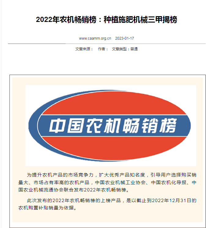 據(jù)中國農(nóng)機(jī)網(wǎng)最新消息,為提升農(nóng)機(jī)產(chǎn)品的市場競爭力,擴(kuò)大優(yōu)秀產(chǎn)品知名度,引導(dǎo)用戶選擇購買銷量大、市場占有率高的農(nóng)機(jī)產(chǎn)品,中國農(nóng)業(yè)機(jī)械工業(yè)協(xié)會、中國農(nóng)機(jī)化導(dǎo)報(bào)、中國農(nóng)業(yè)機(jī)械流通協(xié)會聯(lián)合發(fā)布2022年農(nóng)機(jī)暢銷榜。亞澳農(nóng)機(jī)進(jìn)入耕整地機(jī)械和種植施肥機(jī)械農(nóng)機(jī)暢銷雙料三甲榜。